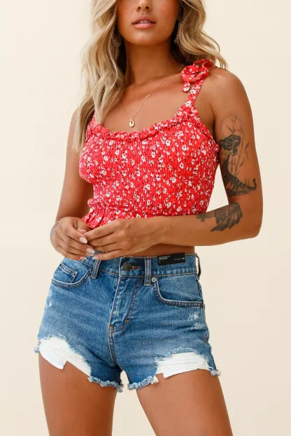 Hey there, cutie! You are causing quite the commotion in our adorable Daisy Chain crop top. We are head over heels for those super cute tied shoulders and girly frill trim. Perfect for a girls' day out or music festival, teamed with cut-off shorts and western boots.