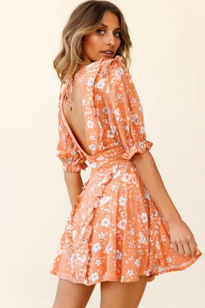 First Impressions Puff Sleeve Keyhole Back Dress Floral Print Orange/Pink