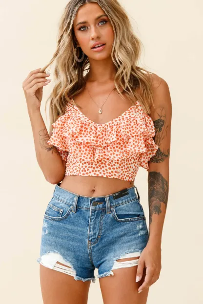 Make an entrance in our super hot Florida Keys crop top. Featuring layered ruffles in the bodice and ruffle sleeves. Perfect for a girls' night out or lunch dates with your beau. Team it with our Charleston high-waisted pants for a look we are loving.