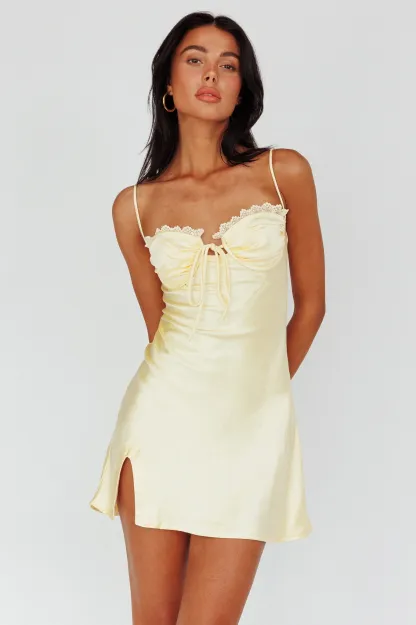 Get ready for some double takes as you walk in wearing our Fortune mini dress. Featuring a lace trim and tie detail in the bust. It's perfect for a glam girls' night out. Team it with perspex heels and a saddle bag for a look we are loving.