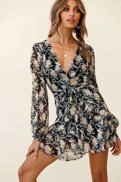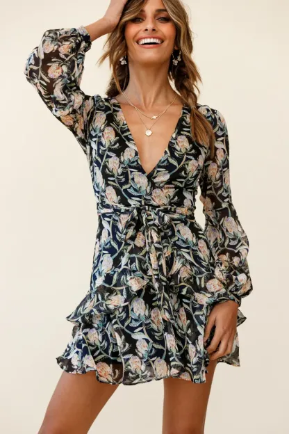 Kerry Layered Balloon Sleeve Dress Banksia Print Black