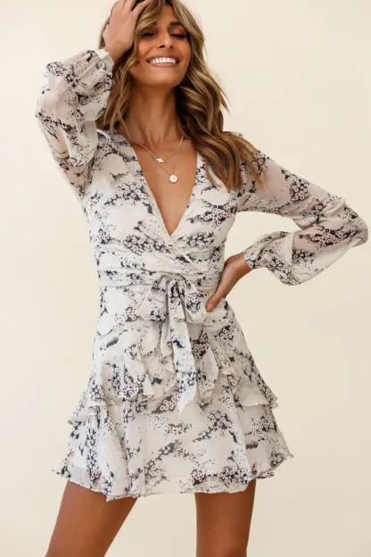 Work gala? Girls' night out? This pretty dress has you covered. Partially lined, with its on-trend ruffles, long balloon sleeves and flattering, faux-wrap neckline, you'll be turning heads everywhere you go. Pair it with single strap nude heels or ankle boots for a look we are loving.