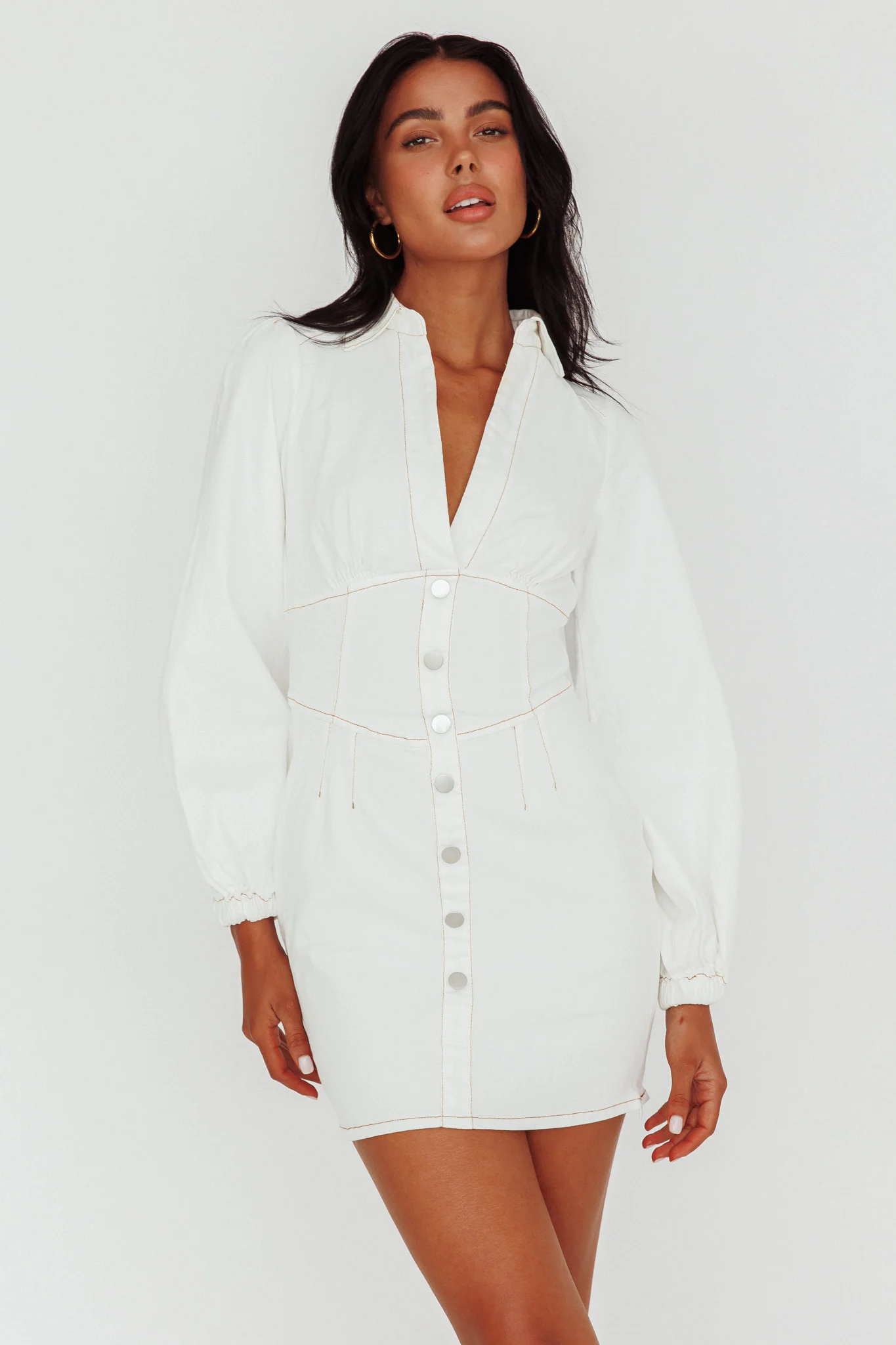 Turn heads in our super cute South Beach mini dress. We are loving the collared neckline and long, balloon sleeves. Perfect for weekends strolling the beach boardwalk with your beau. Team it with wedges for a night out with your girls or white sneakers for a cute-casual look we are crushing on.