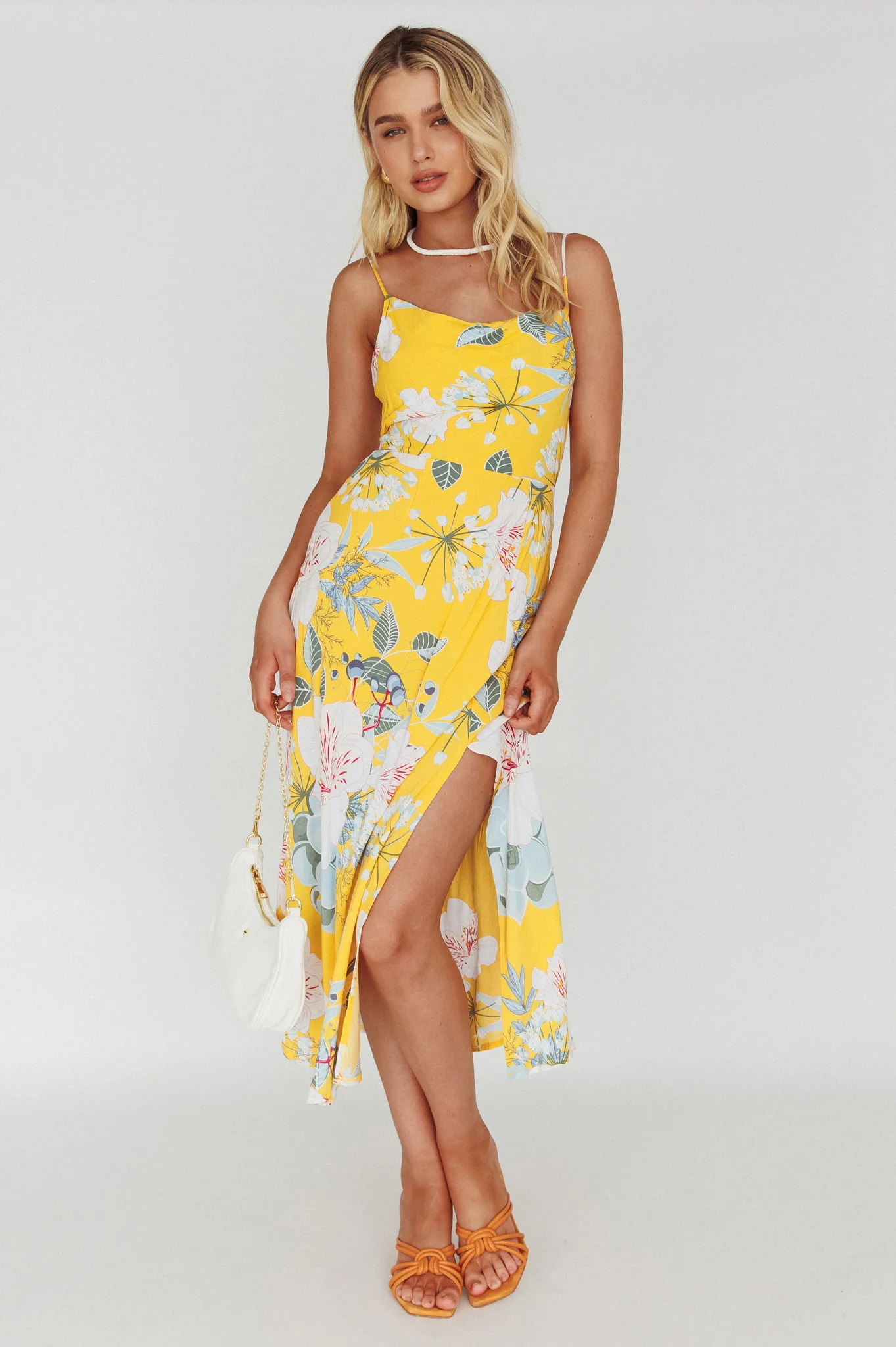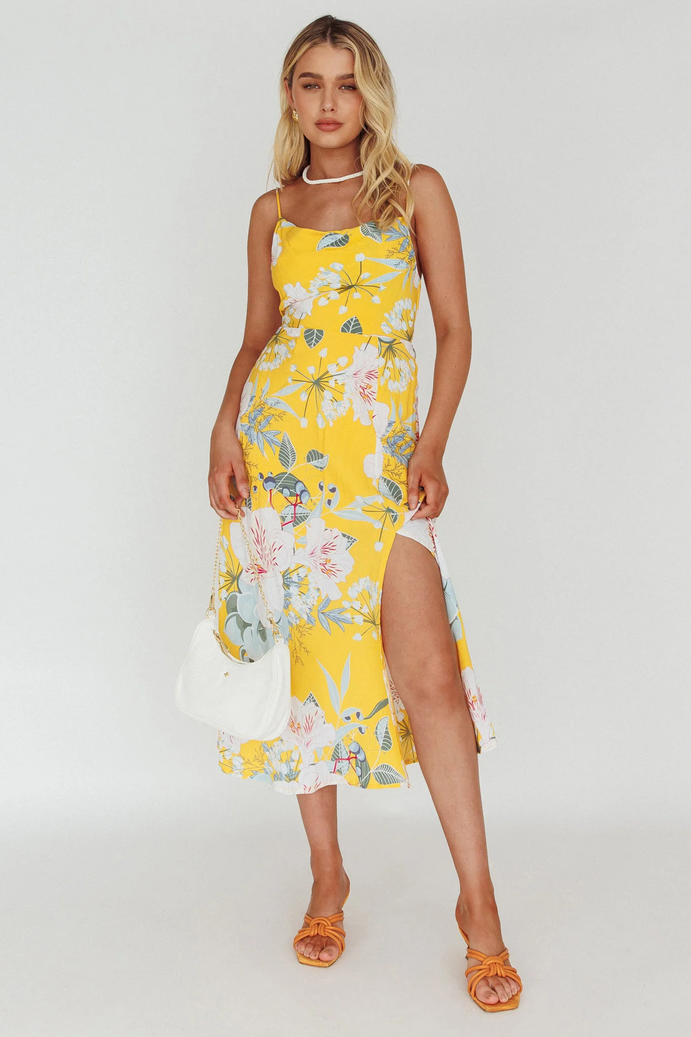 Make an entrance in our gorgeous Suki dress. Featuring a classy silhouette with a breezy front split. We are in love with that cowl neckline and silky fabric. Perfect for a flirty first date or a wedding teamed with nude, tie-up heels and a clutch.