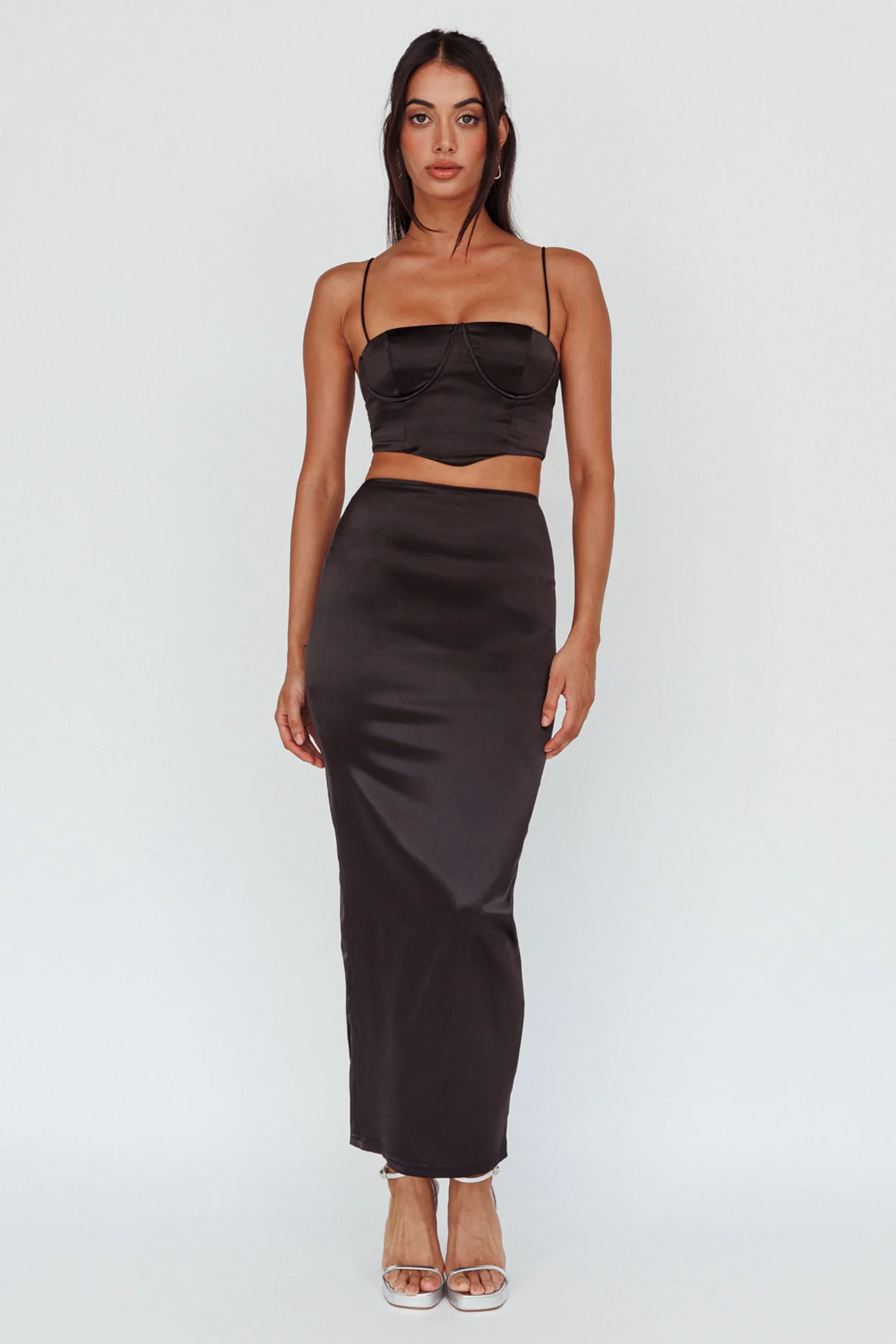 You'll go straight to the best-dressed list in our super cute Zeina midi skirt. We are in love with its soft, satin fabric and on-trend hue! Perfect for a girls' night out teamed with its matching crop top and strappy heels.